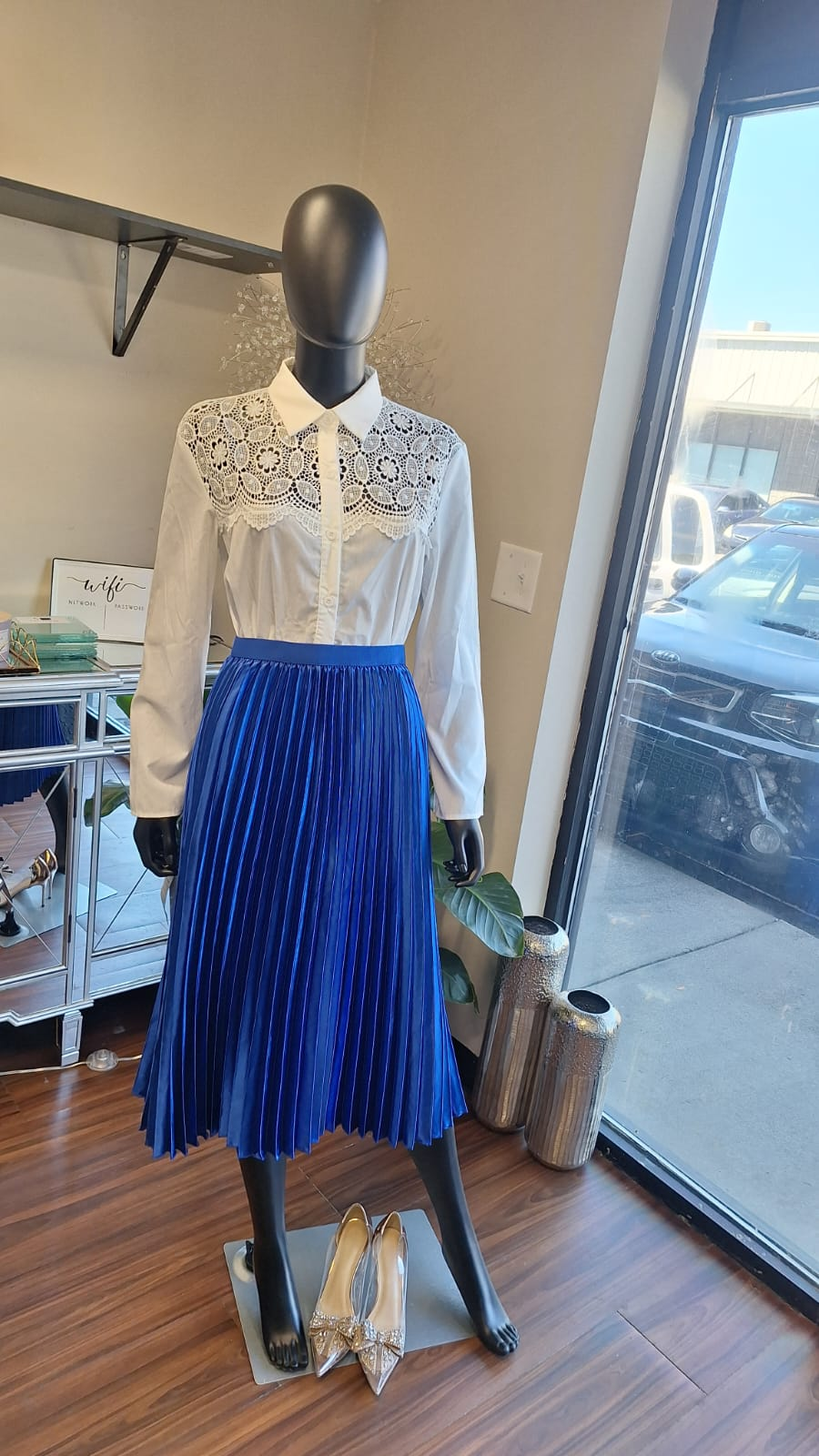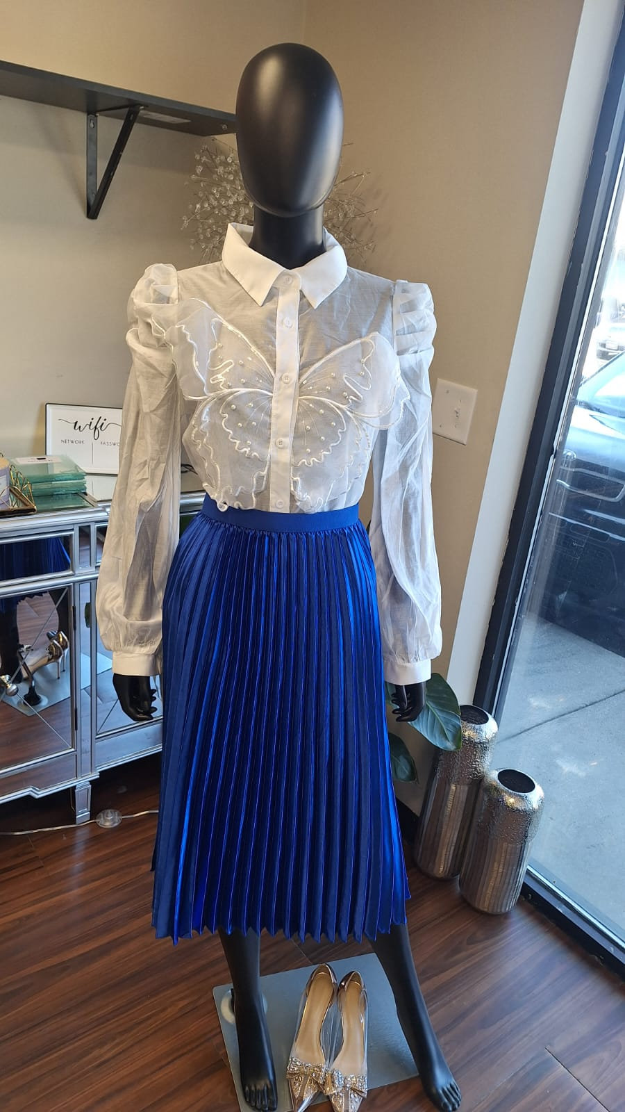 These pieces blend expressive detail with bold silhouettes. The embroidery evokes poetic depth, while the skirt’s deep blue lines guide the eye with graceful intention. Together, they transform routine into ritual—styling that speaks with elegance and emotional clarity.
