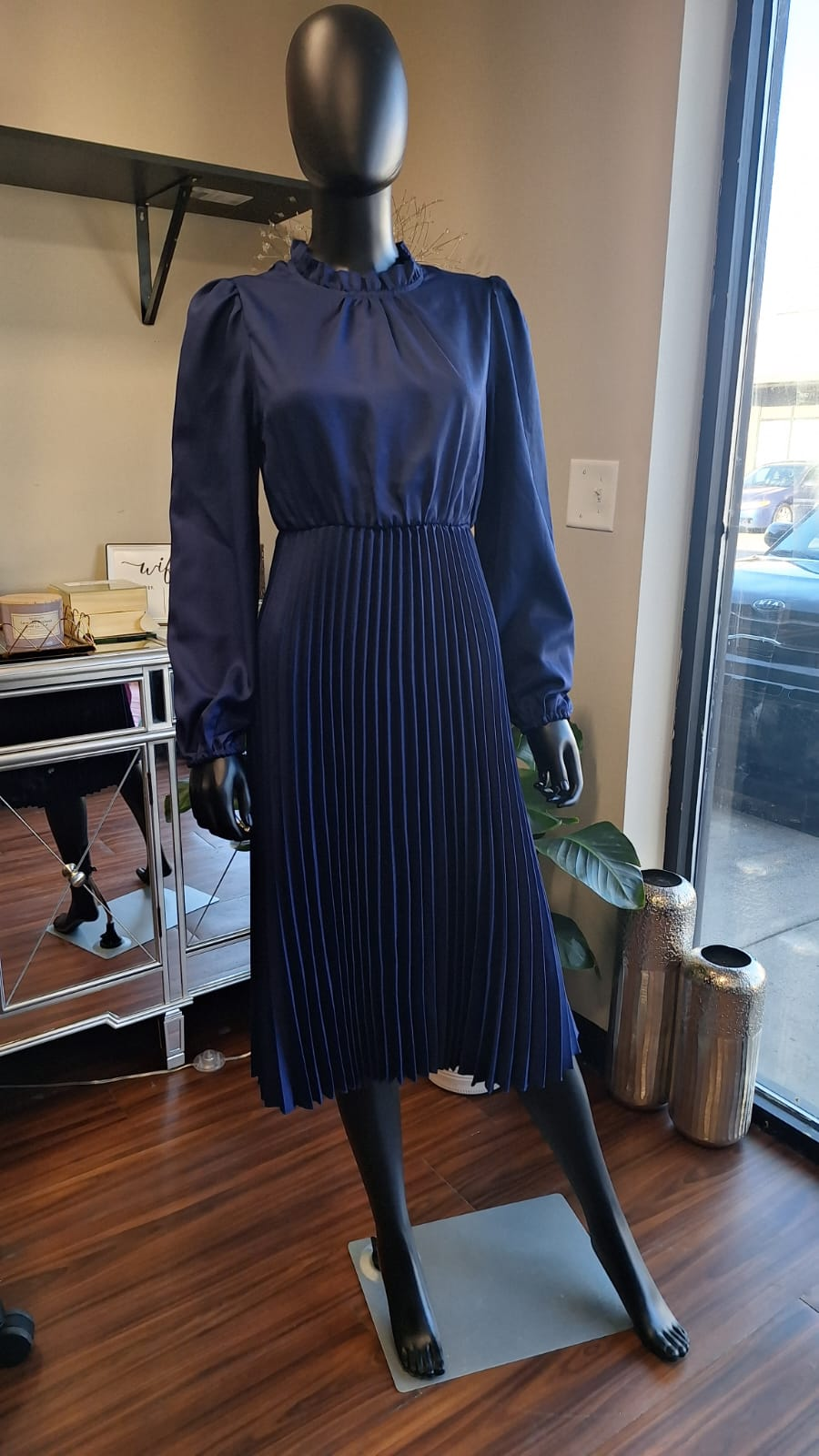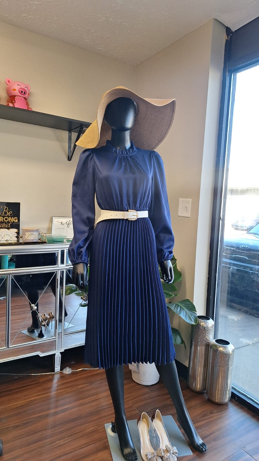 This sophisticated dark blue dress captures timeless elegance through its tailored bodice and graceful fan-shaped skirt. The pleated design adds fluidity and depth, creating a silhouette that moves with quiet drama. Ideal for evening events, formal gatherings, or moments where poise and beauty speak louder than words.
