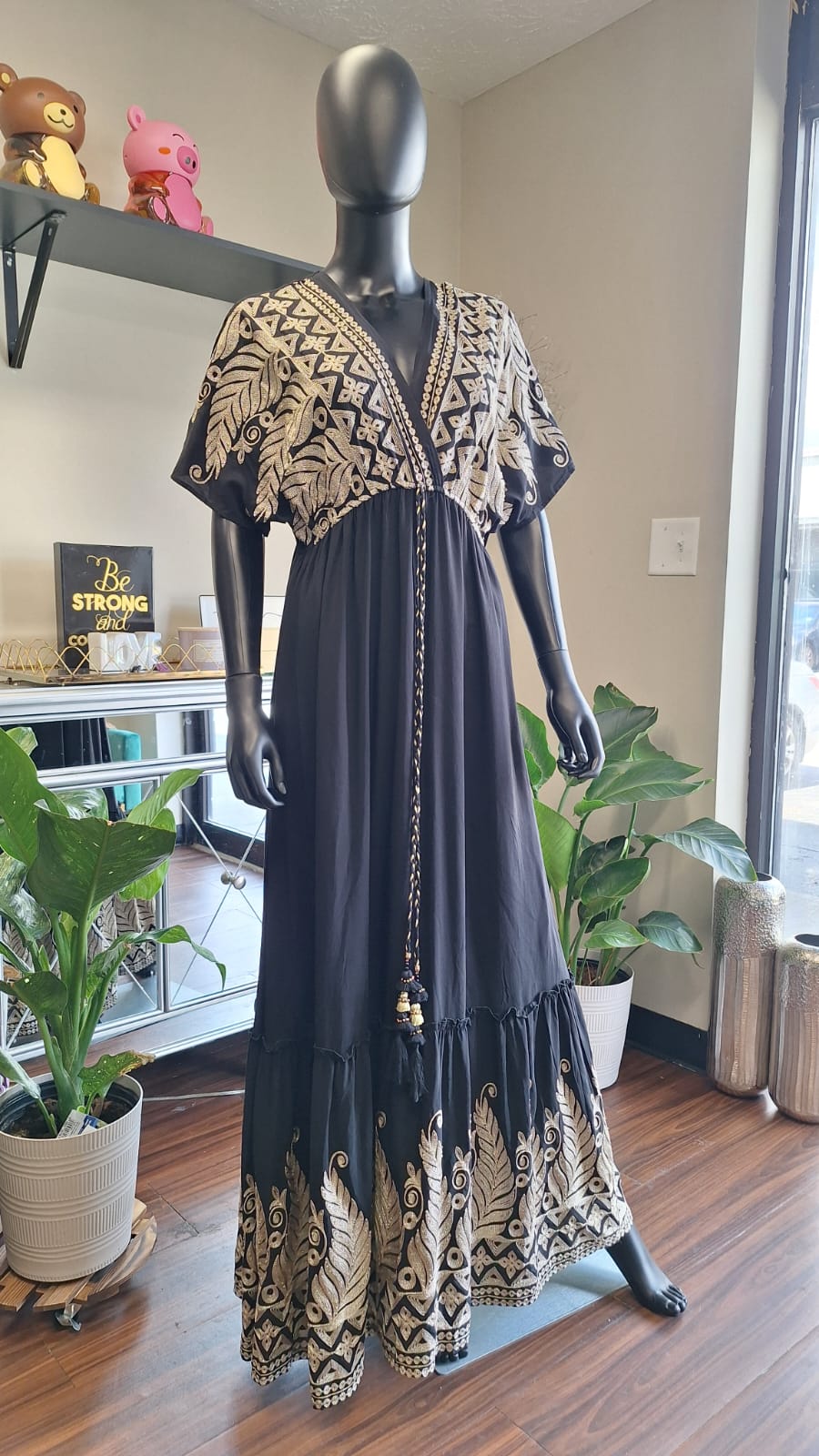 This breathtaking black dress is a celebration of contrast and sophistication. Adorned with intricate golden designs that shimmer against the deep fabric, it creates a silhouette that’s both regal and magnetic. The tailored fit enhances every curve with elegance, while the gold accents add a touch of opulence that catches the light—and every eye. Perfect for evening events, galas, or moments where you want to embody power and grace in equal measure